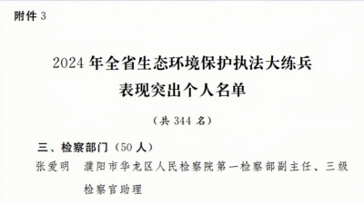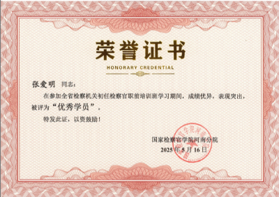 濮阳市华龙区人民检察院干警张爱明在全省检察机关初任检察官职前培训学习期间,成绩优异,表现突出,被评为“优…