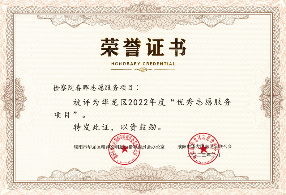 2015年6月华龙区检察院成立未成年人“春晖志愿服务队”。随着工作量的加大,2018年年初,扩大建设更名为“濮阳市检察机关未成年人法治教育基地”,用于向未成年人讲授法律、解决困惑、心理疏导,让他们懂得用法律规范自己的言行、保护自身的权益。7年来,志愿者们先后接待我市未成年人参观400余批、18000余人,志愿者们始终用爱心去呵护,用温情去守护,引领未成年人心灵回归,很多时候都是利用节假日的休息时间来做,因为他们有一个共同的名字叫做“春晖未检志愿服务团队”。