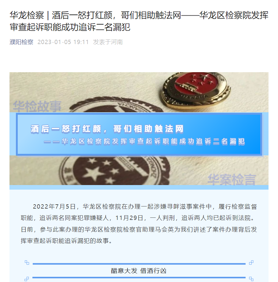 2022年7月5日,濮阳市华龙区检察院在办理一起涉嫌寻衅滋事案件中,履行检察监督职能,追诉两名同案犯罪嫌疑人,11月29日,一人判刑,追诉两人均已起诉到法院。日前,参与此案办理的华龙区检察院检察官助理马会英为我们讲述了案件办理背后发挥审查起诉职能追诉漏犯的故事。