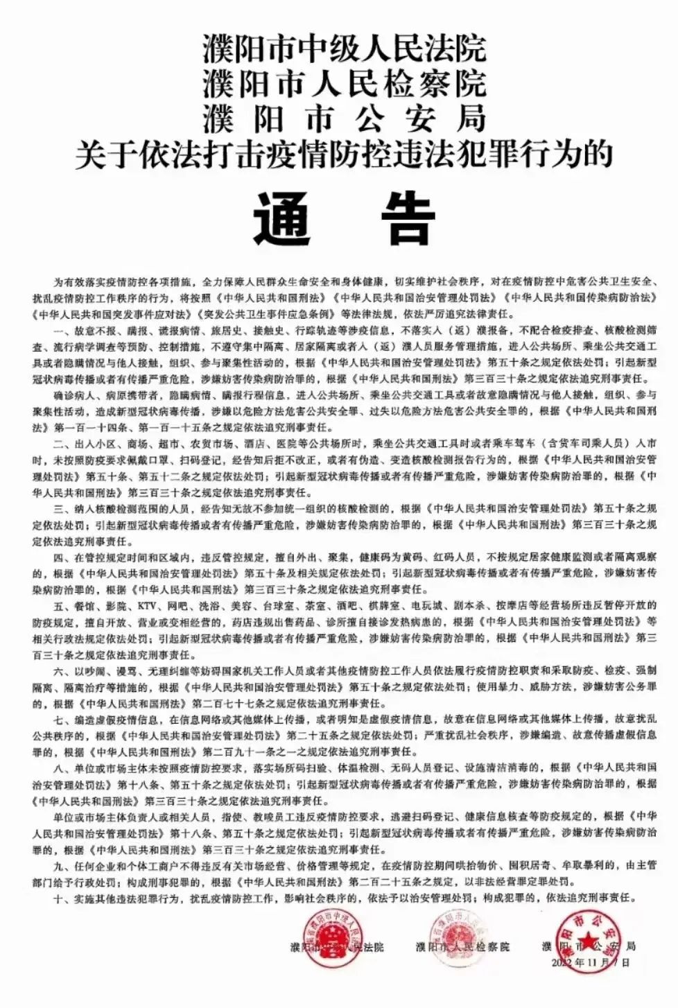 一、故意不报、瞒报、谎报病情、旅居史、接触史、行踪轨迹等涉疫信息,不落实入(返)濮报备,不配合检疫排查、核酸检测筛查、流行病学调查等预防、控制措施,不遵守集中隔离、居家隔离或者入(返)濮人员服务管理措施,进入公共场所、乘坐公共交通工具或者隐瞒情况与他人接触,组织、参与聚集性活动的,根据《中华人民共和国治安管理处罚法》第五十条之规定依法处罚;引起新型冠状病毒传播或者有传播严重危险,涉嫌妨害传染病防治罪的,根据《中华人民共和国刑法》第三百三十条之规定依法追究刑事责任。