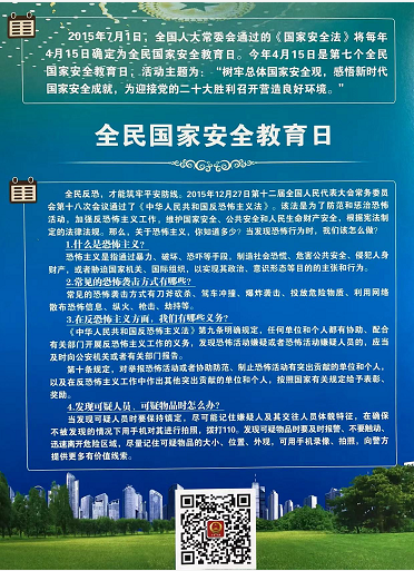 2015年7月1日,全国人大常委会通过的《国家安全法》将每年4月15日确定为全民国家安全教育日。今年4月15日是第七个全民国家安全教育日,活动主题为:“树牢总体国家安全观,感悟新时代国家安全成就,为迎接党的二十大胜利召开营造良好环境。”