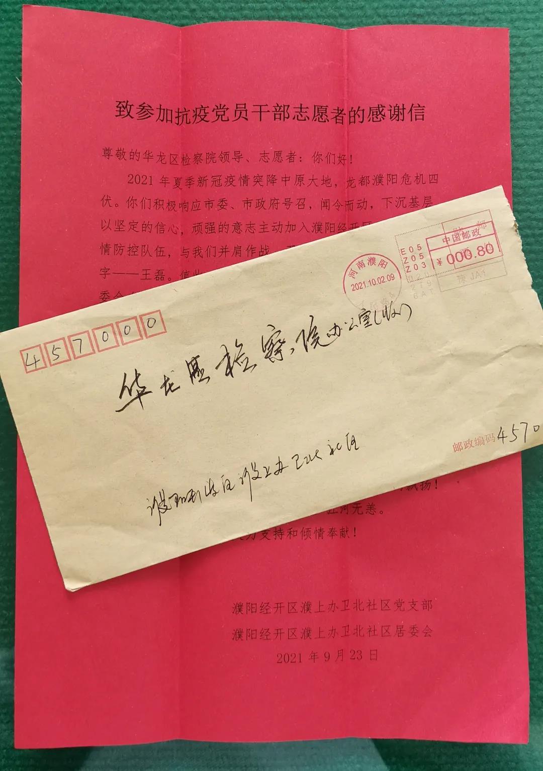 近日,濮阳经开区濮上办卫北社区给华龙区人民检察院寄来一封感谢信,对其社区居民王磊在疫情防控中所做出的贡献表示感谢。收到这封感谢信,大家并不感到意外,王磊同志在日常工作和生活中心系集体、无私奉献,他的所作所为早已深深镌刻在每一名干警的心里。