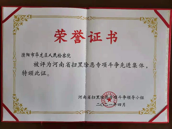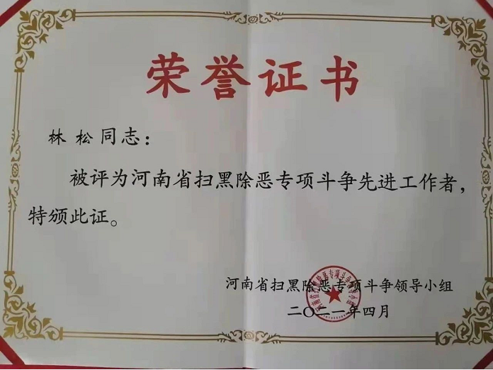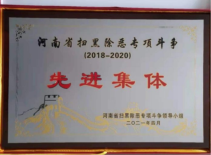 被河南省扫黑除恶专项斗争领导小组评为河南省扫黑除恶专项斗争