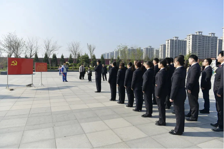 王长举副检察长带领干警重温入党誓词,举行宣誓仪式。全体干警举起右手,面向党旗庄严宣誓,坚定了理想信念,受到了精神洗礼。在烈士墓碑前,全体干警怀着无比崇敬的心情,敬献花篮,王长举副检察长上前整理花篮挽联。全体干警向长眠于此的烈士行三鞠躬礼,并列队敬献鲜花,瞻仰烈士墓,寄托对先烈的哀思。