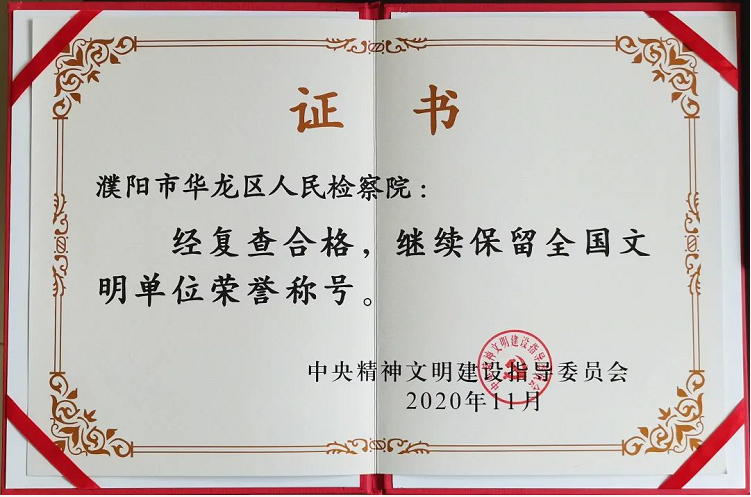 新年伊始喜讯传。华龙区人民检察院顺利通过全国文明单位复审,连续三届荣获“全国文明单位”称号,成为我市唯一一家获此殊荣的基层单位。