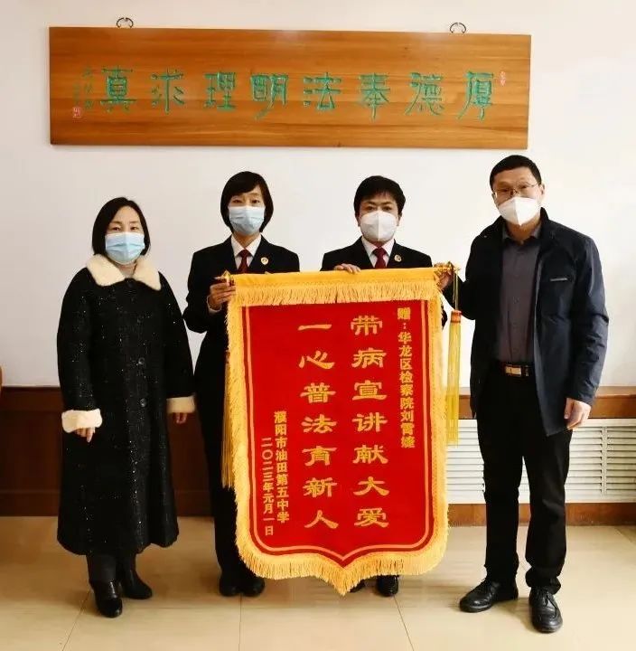 “谢谢刘检察官担任法治副校长以来对学校工作的大力支持,学校特意做了一面锦旗表示感谢!”近日,濮阳市油田第五中学的老师们送来了一面锦旗,对“蓝天工作室”成立以来法治副校长的工作表示感谢。