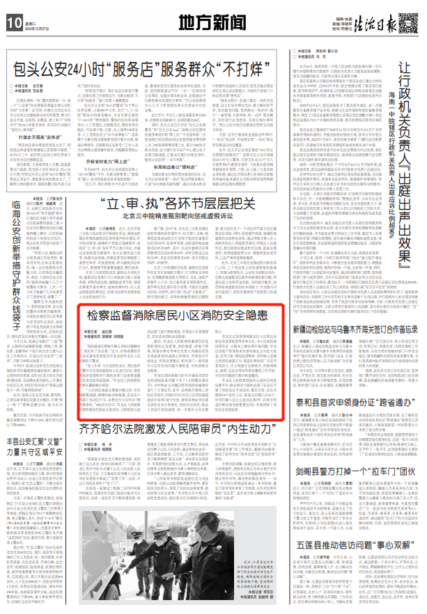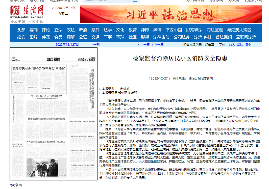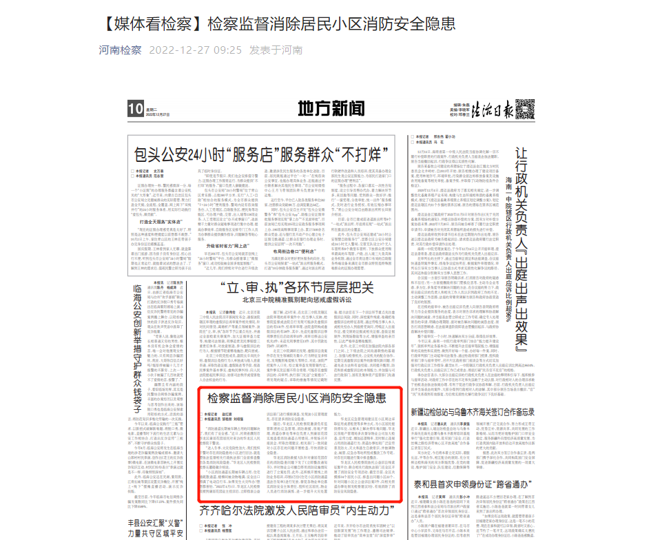 法治日报、法治网、河南检察微信公众号等多家媒体转发我院《检察监督消除居民小区消防安全隐患》。