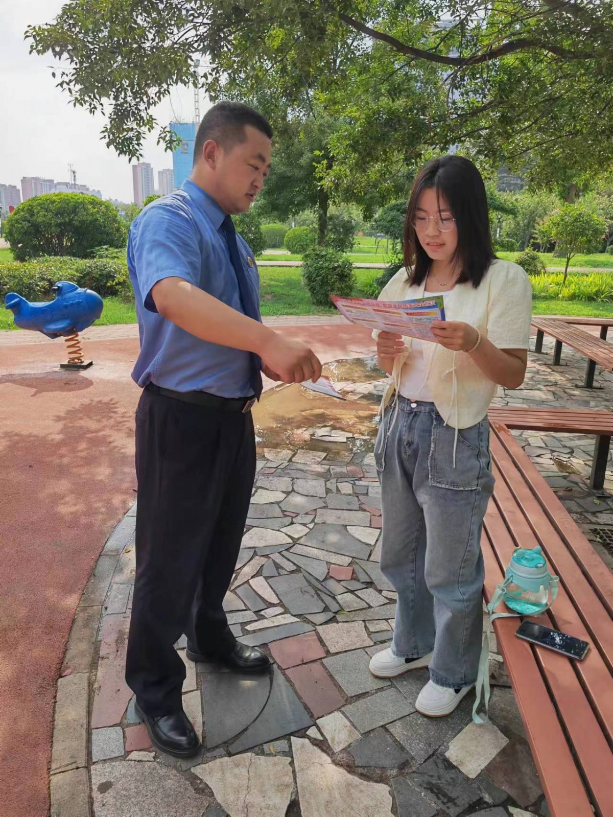 雨后的未名园绿树成荫,白云朵朵。为进一步让社会公众了解国家安全方面的法律知识,提高群众的国家安全意识,树立责任和保护意识,7月31日,濮阳市华龙区人民检察院国家安全宣传小队来到了未名园,开展国家安全宣传教育活动。