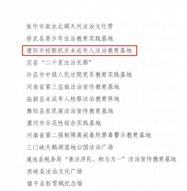 八五”普法开展以来,全省各地各部门认真学习宣传贯彻习近平法治思想,认真贯彻落实中共中央办公厅、国务院办公厅《关于加强社会主义法治文化建设的意见》,把法治文化阵地建设作为提升公民法治素养、推进法治化进程的重要载体和平台整体谋划,多方联动,建成了一批主题鲜明、富有特色、群众乐见、影响广泛的法治文化阵地,其中,濮阳市检察机关未成年人法治教育基地入选全省优秀法治宣传教育基地。