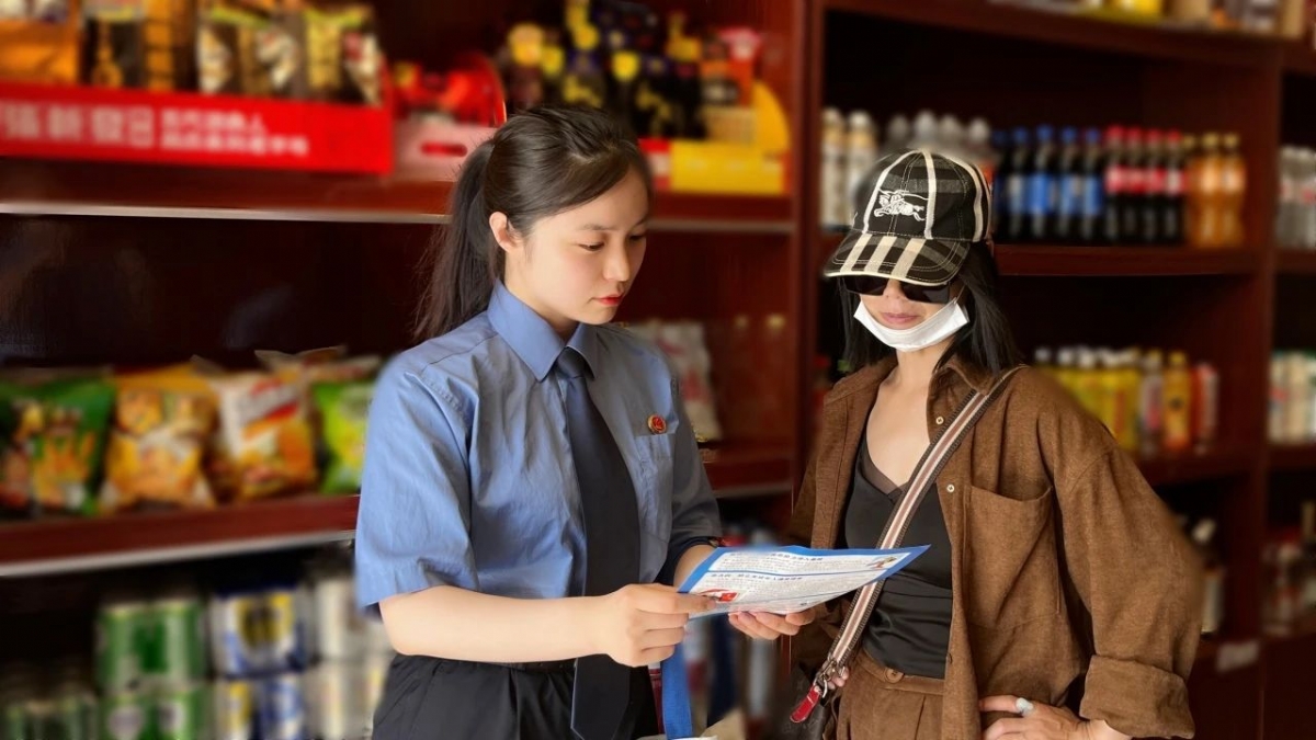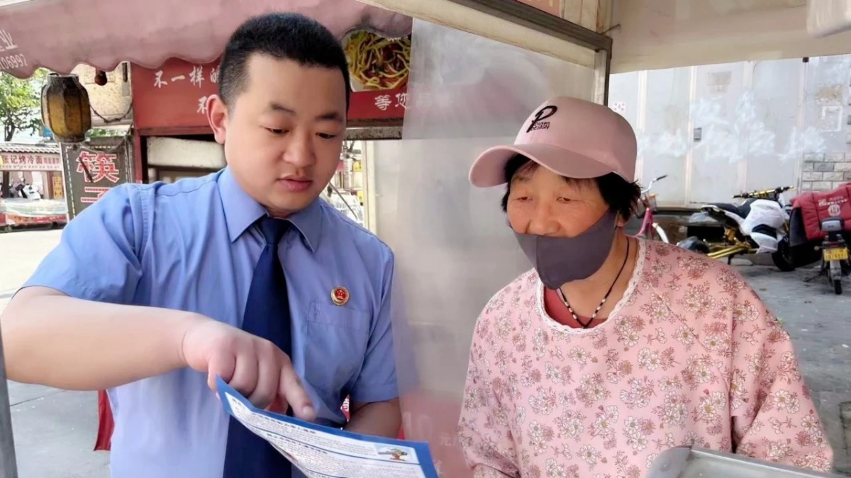 活动中,干警通过发放宣传手册、解答涉黑恶问题的方式向学生家长、附近商铺进行普法宣传。