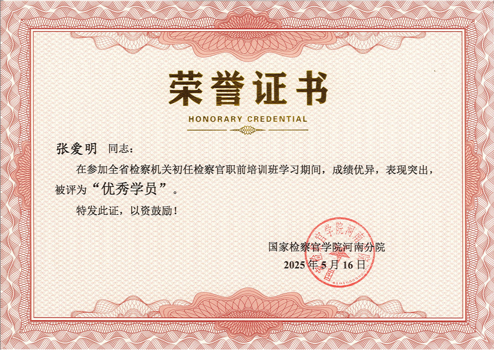在全省检察机关初任检察官职前培训学习期间,成绩优异,表现突出,被评为