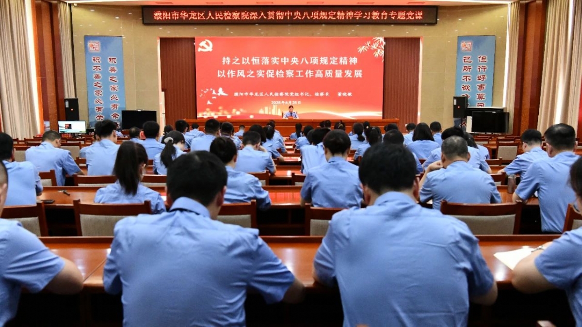 为扎实开展深入贯彻中央八项规定精神学习教育,推动全面从严治党向纵深发展,6月25日,华龙区人民检察院党组书记、检察长董晓敏以《持之以恒落实中央八项规定精神 以过硬作风促检察工作高质量发展》为题,为全院干警讲授专题党课。 董晓敏结合自身的学习理解,从开展学习教育的重大意义、扎实开展纠治违规吃喝歪风专项整治和切实把新风正气转化为推进检察工作高质量发展的成效等方面进行了深刻阐述。 一是深刻认识优良作风作为司法公正根基、队伍形象底色、风险抵御盔甲和改革活力动力的根本性意义。二是清醒正视作风问题的反复性与顽固性,以案为鉴,直面作风问题危害,让问题病灶在阳光下无处遁形。三是聚焦靶心立行立改,在司法为民上显温度,在履职尽责上求准度,在廉洁自律上守底线,在勤俭高效上提效能。四是刀刃向内强化刚性监督,压实主体责任,狠抓督察检查,从严执纪问责,确保作风建设要求真正落地生根。 董晓敏强调,全院干警必须以高度自觉深化落实中央八项规定精神,持续纠治“四风”,将优良作风融入工作日常,内化于心、外化于行。